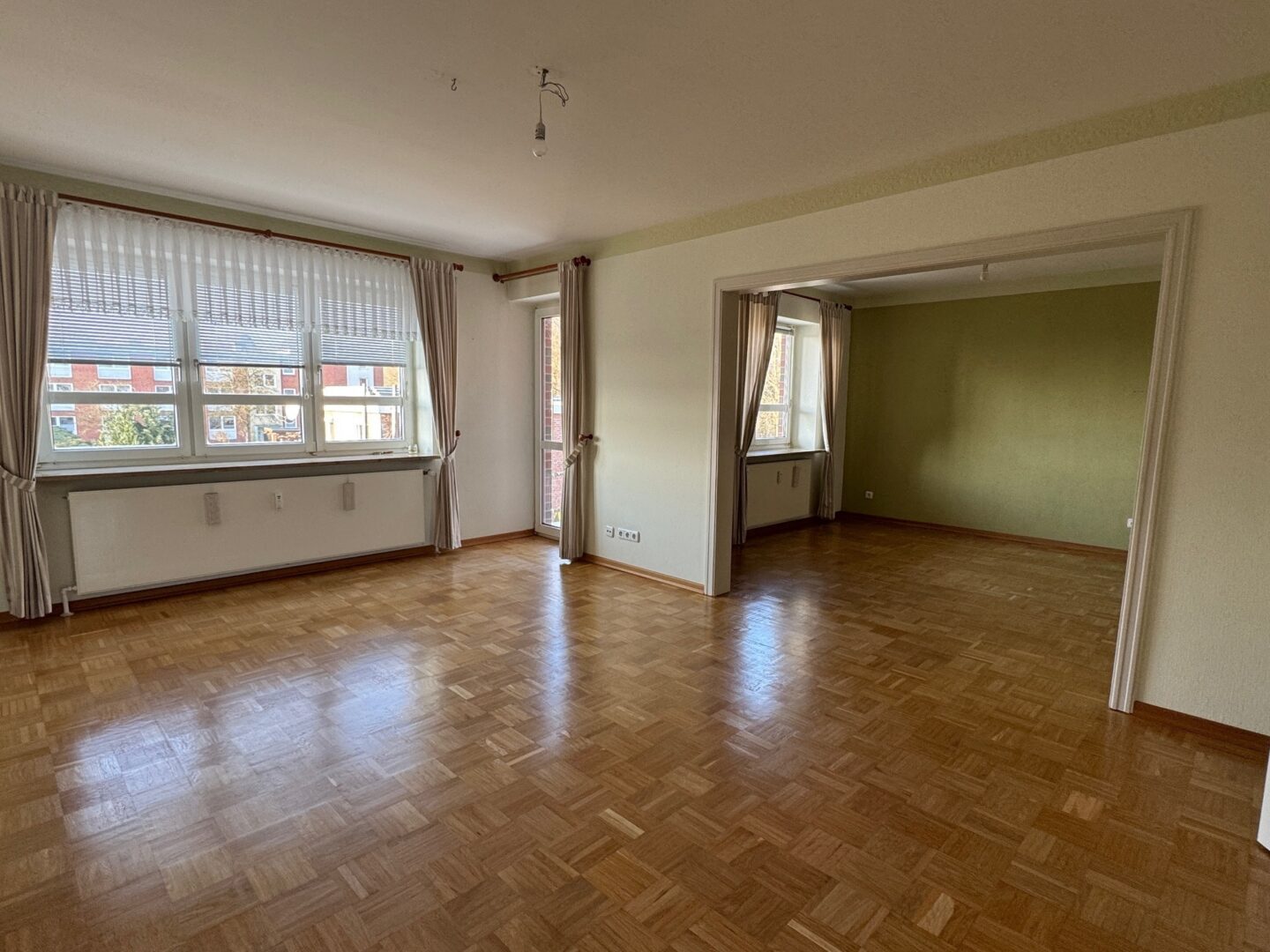 Ein besonderes Highlight ist das großzügige Wohnzimmer, das über eine elegante, doppelflügelige Glastür vom Essbereich aus betreten wird. Durch den früheren Rückbau einer Trennwand entstand ein weitläufiger Wohnbereich mit viel Licht und Raumgefühl. Ursprünglich war dieser Bereich als separates Zimmer genutzt – eine Wiederherstellung der Wand ist jederzeit problemlos möglich und bietet somit maximale Flexibilität in der Raumgestaltung.