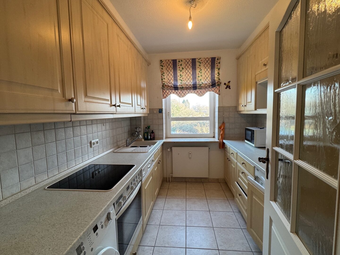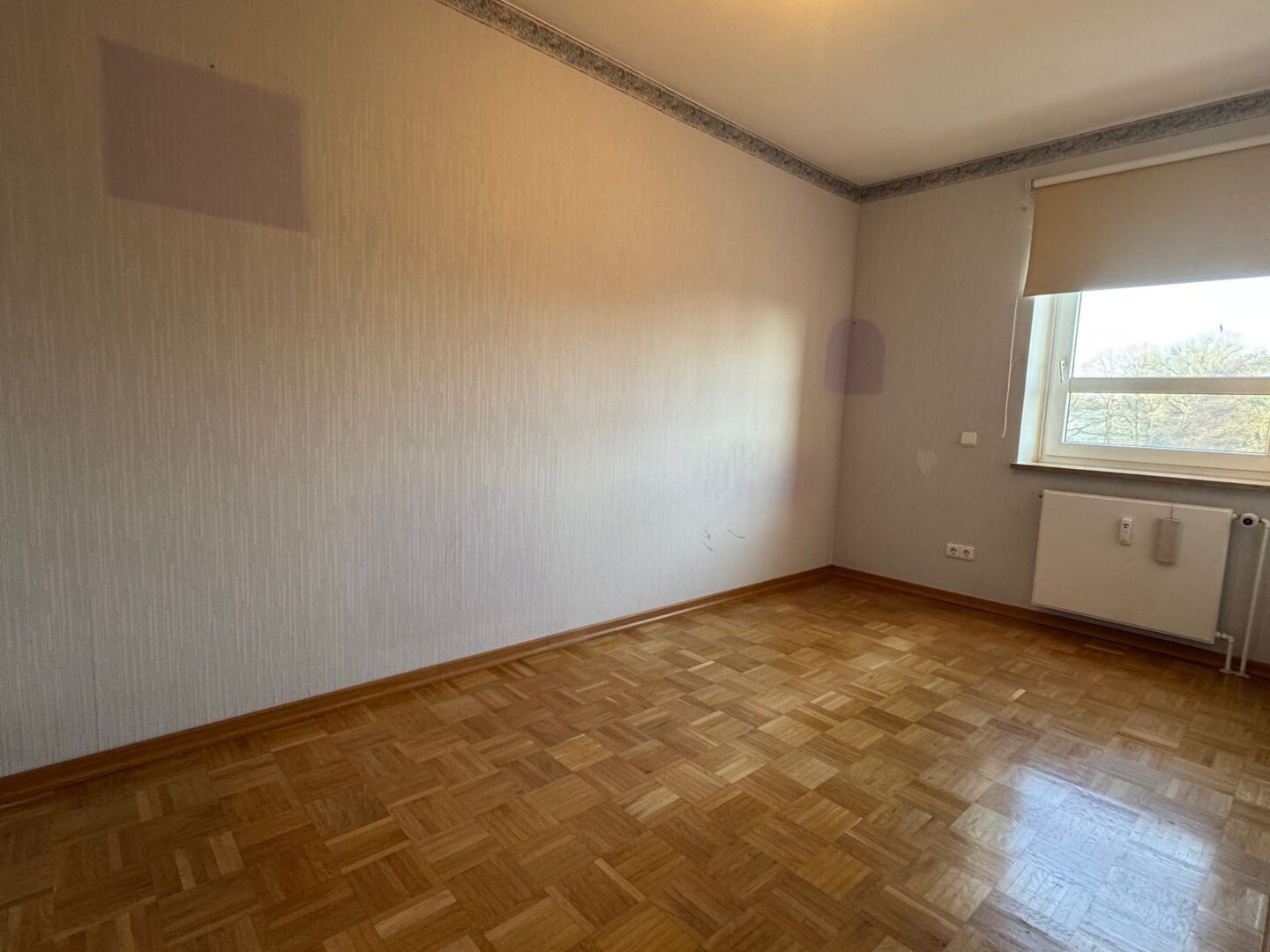 Der private Bereich der Wohnung ist durch eine Tür klar vom Wohn- und Essbereich getrennt. Hier befinden sich ein ruhiges Schlafzimmer sowie ein weiteres Zimmer, das sich ideal als Kinderzimmer oder Homeoffice eignet. Beide Räume bieten einen freien Blick über die angrenzenden Felder, in denen sich regelmäßig Rehe und Hasen zeigen – ein naturnahes Wohnerlebnis mit besonderem Erholungswert.