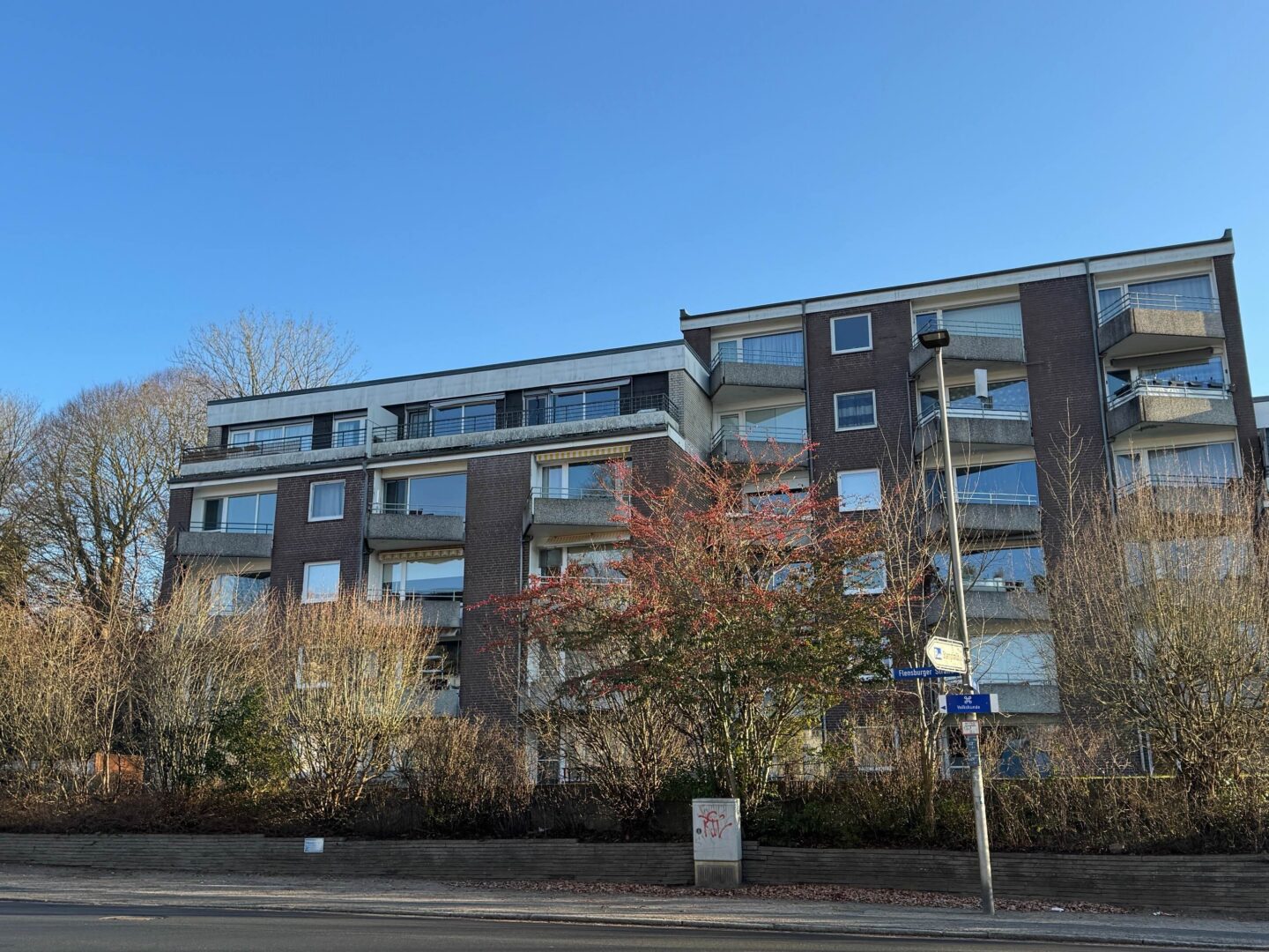 Das lichtdurchflutete Wohnzimmer bildet den Mittelpunkt der Wohnung und überzeugt mit einer außergewöhnlichen Aussicht: Der Blick über die grüne Baumallee zum Schloss Gottorf sowie seitlich auf die Schlei verleiht dem Wohnraum eine besondere Wohnqualität. Der Balkon lädt dazu ein, entspannte Stunden im Freien zu genießen – ob beim Morgenkaffee oder am Abend bei einem Glas Wein.