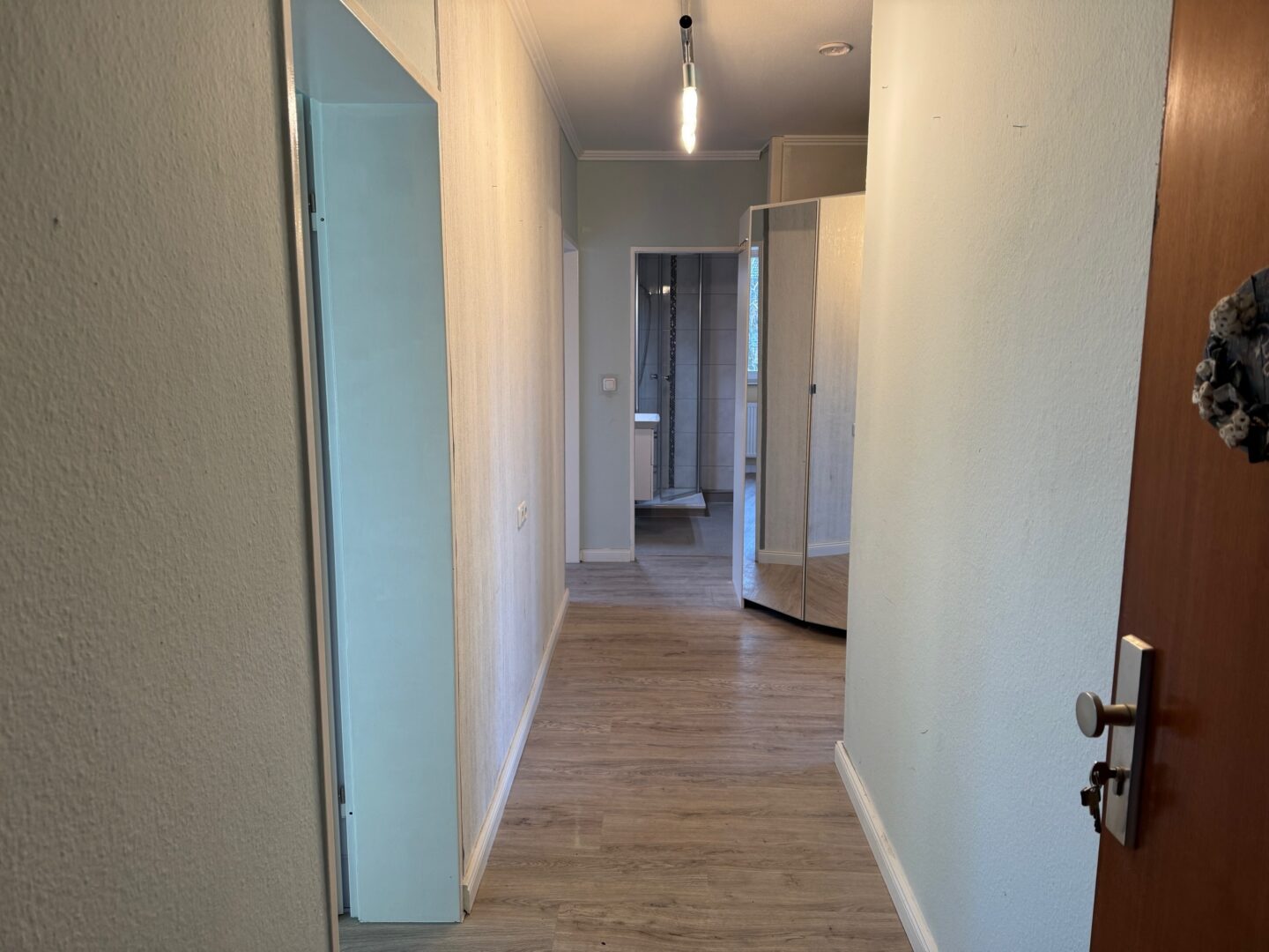Geradeaus befindet sich das erneuerte, innenliegende Badezimmer mit Dusche, das funktional und zeitlos gestaltet ist.